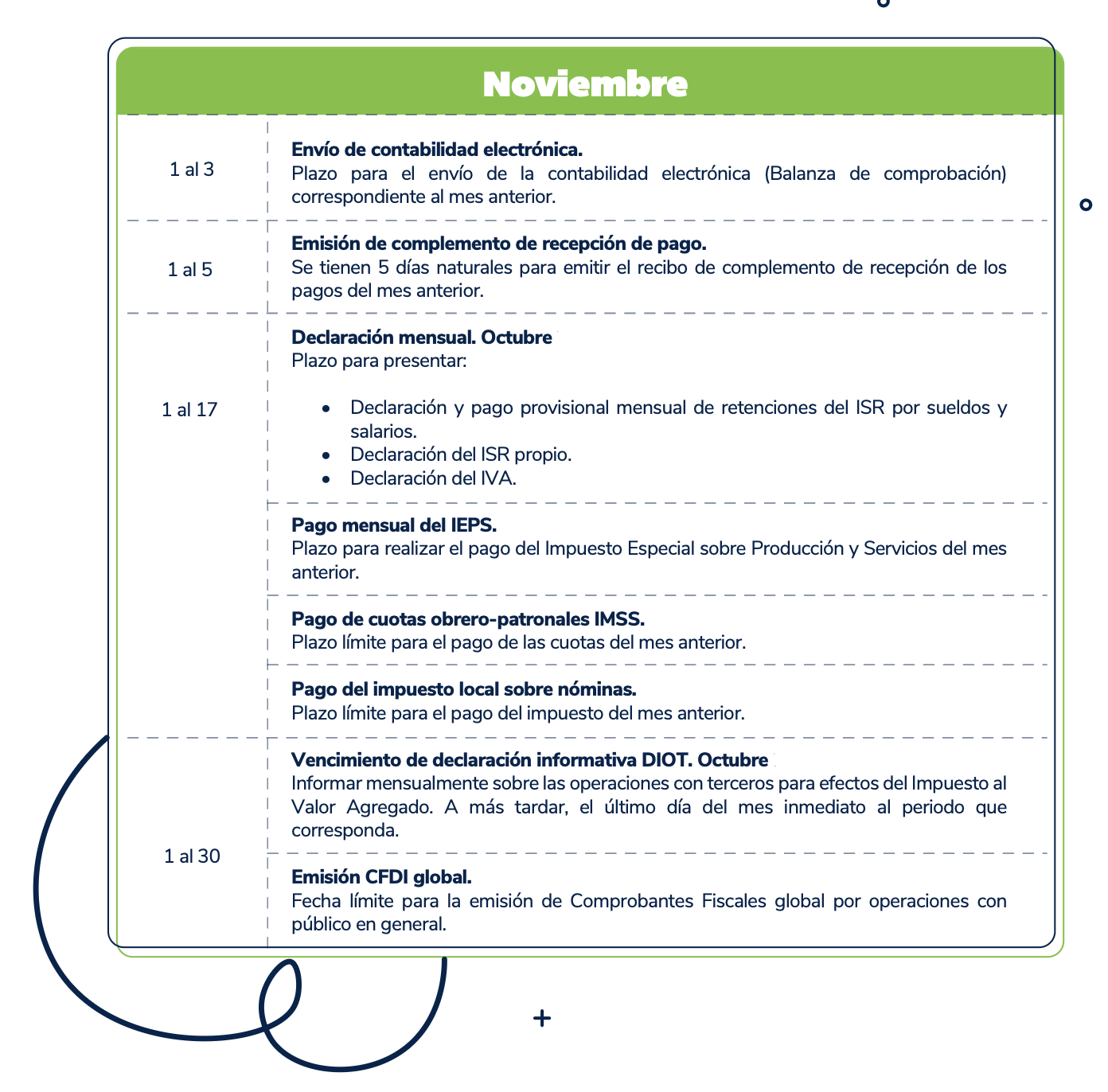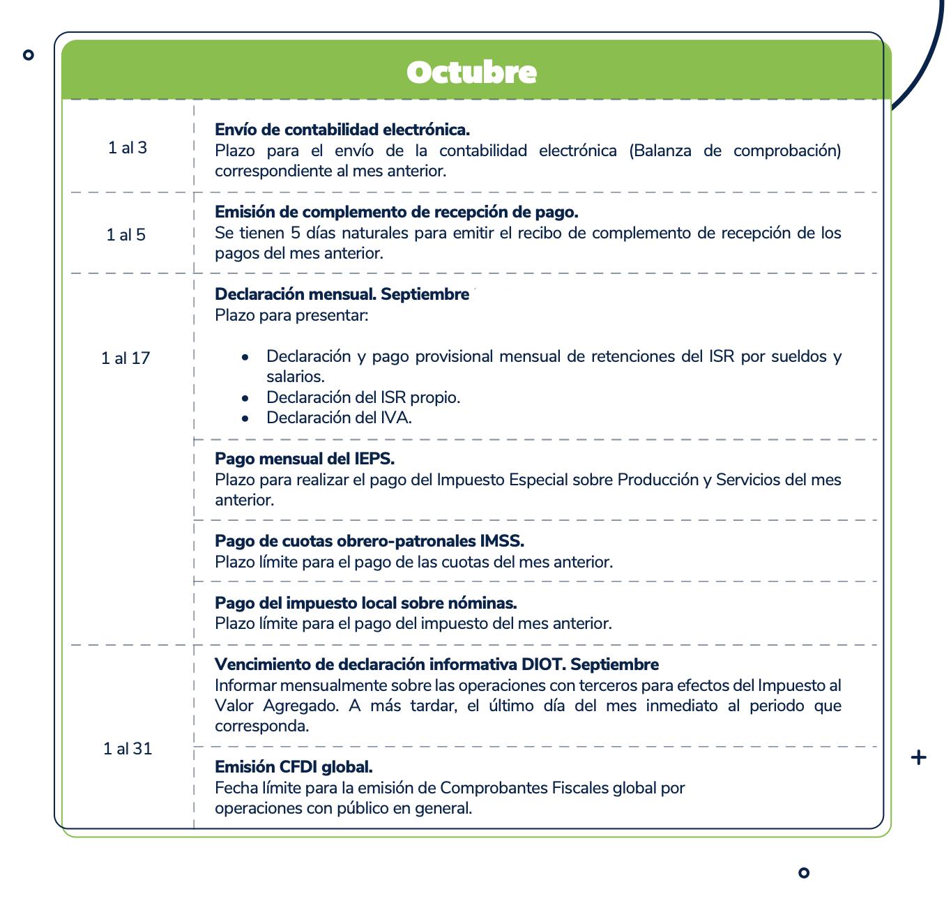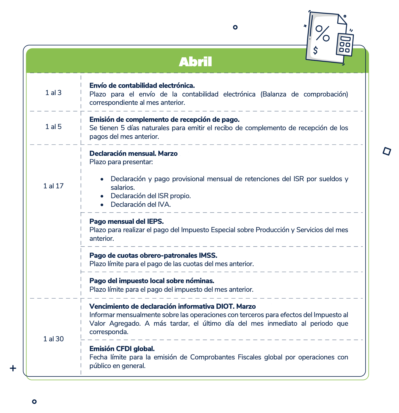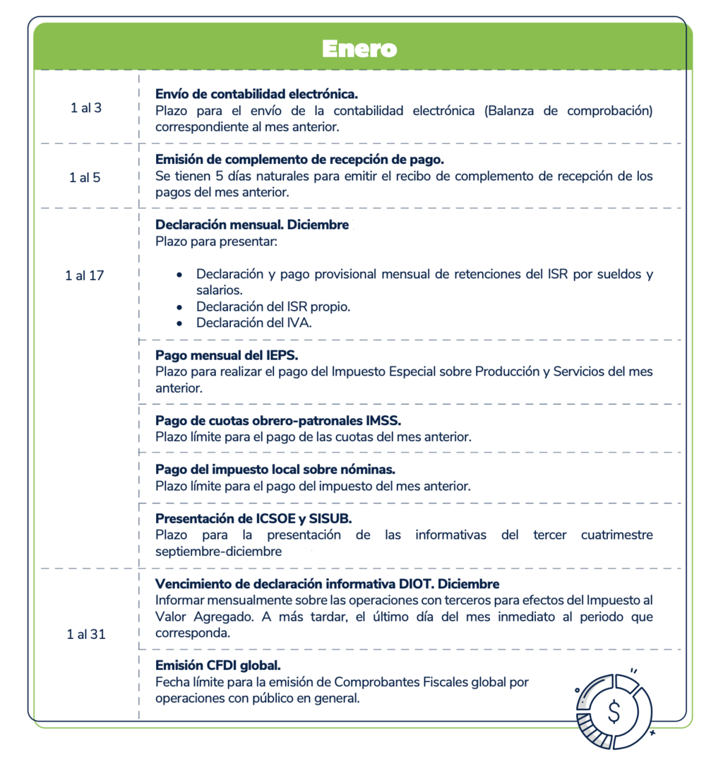 El presente calendario tiene carácter meramente informativo y debe utilizarse únicamente como una referencia general. Se recomienda verificar cualquier disposición con las autoridades fiscales competentes antes de tomar decisiones al respecto.