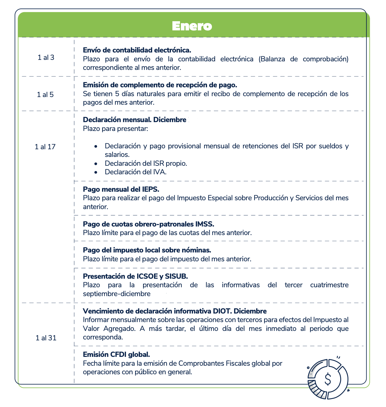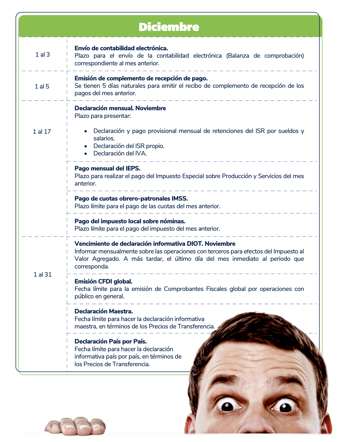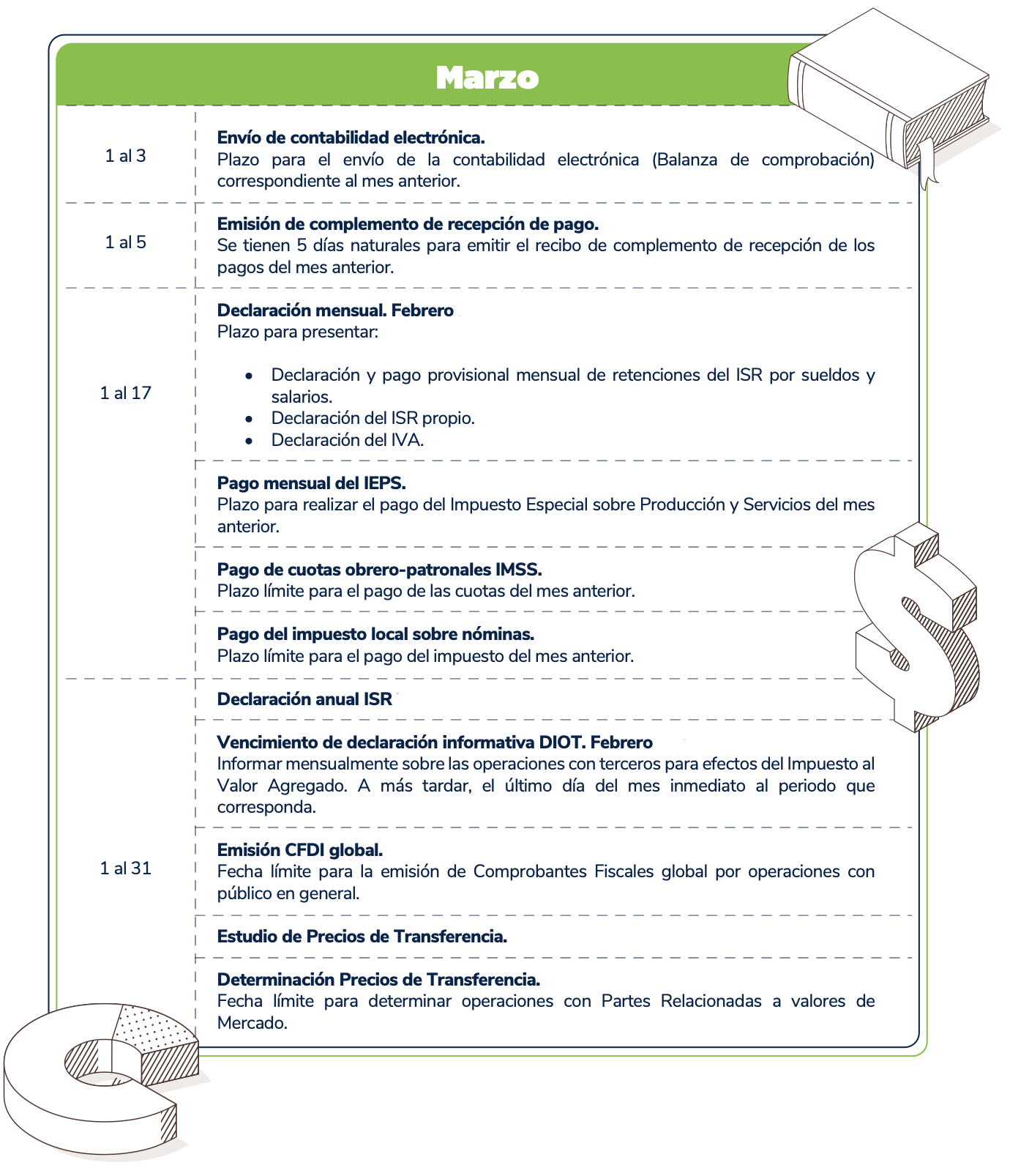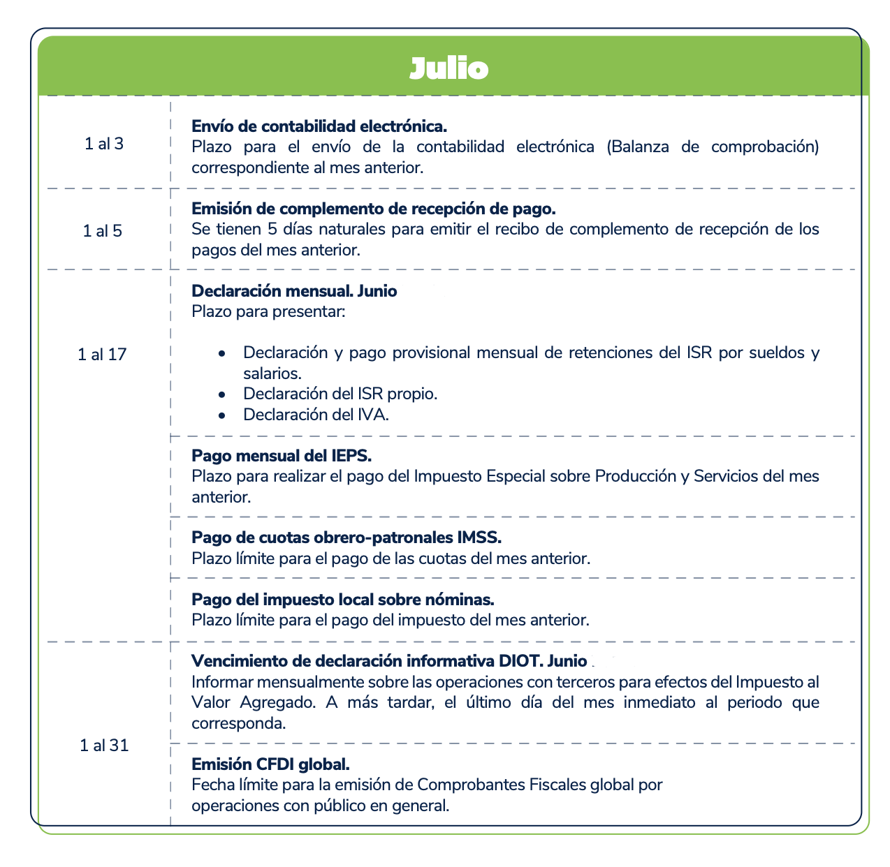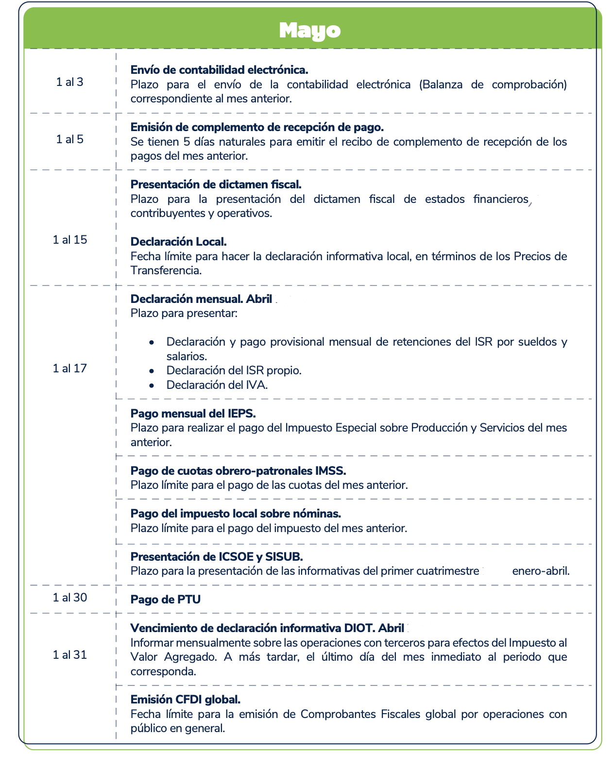 El presente calendario tiene carácter meramente informativo y debe utilizarse únicamente como una referencia general. Se recomienda verificar cualquier disposición con las autoridades fiscales competentes antes de tomar decisiones al respecto.