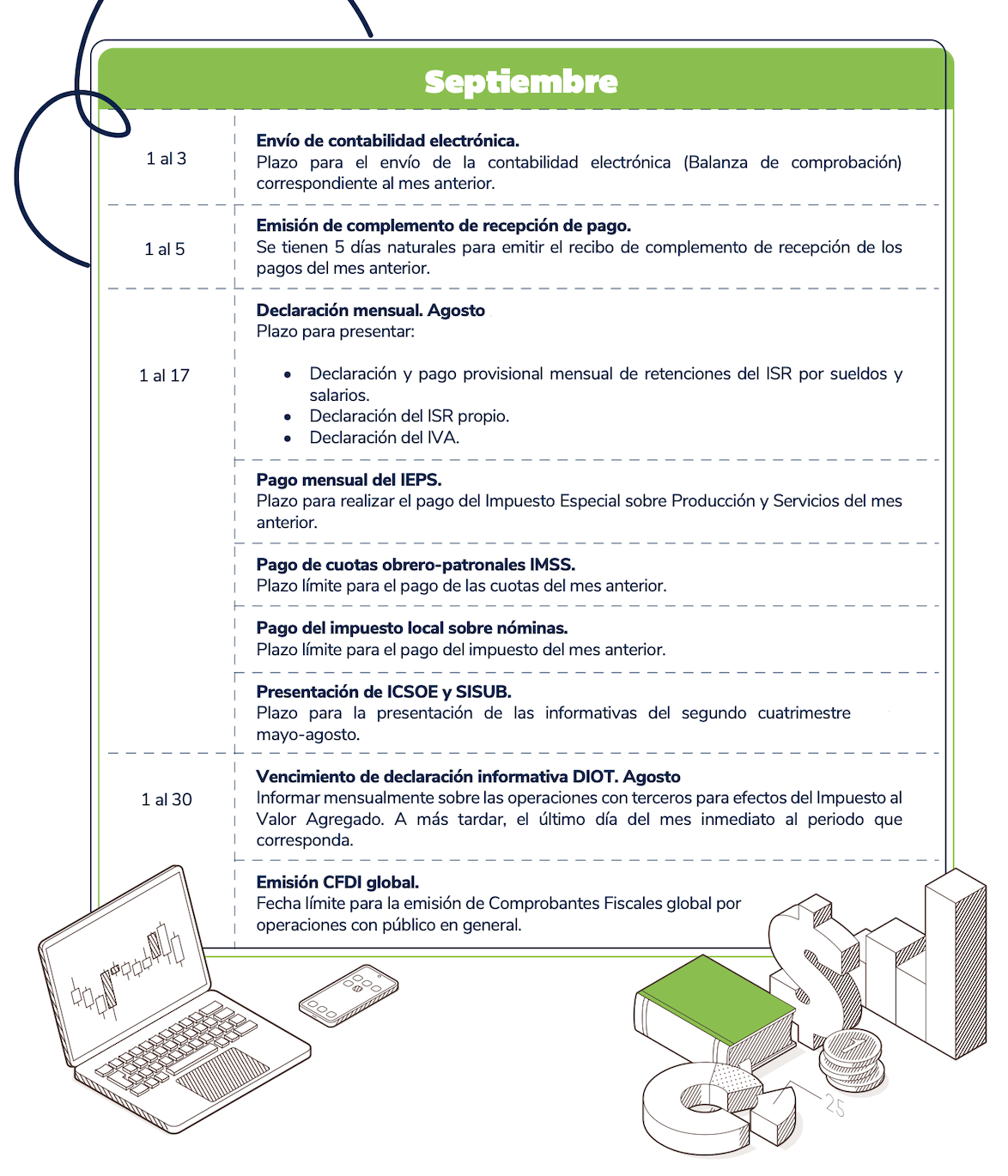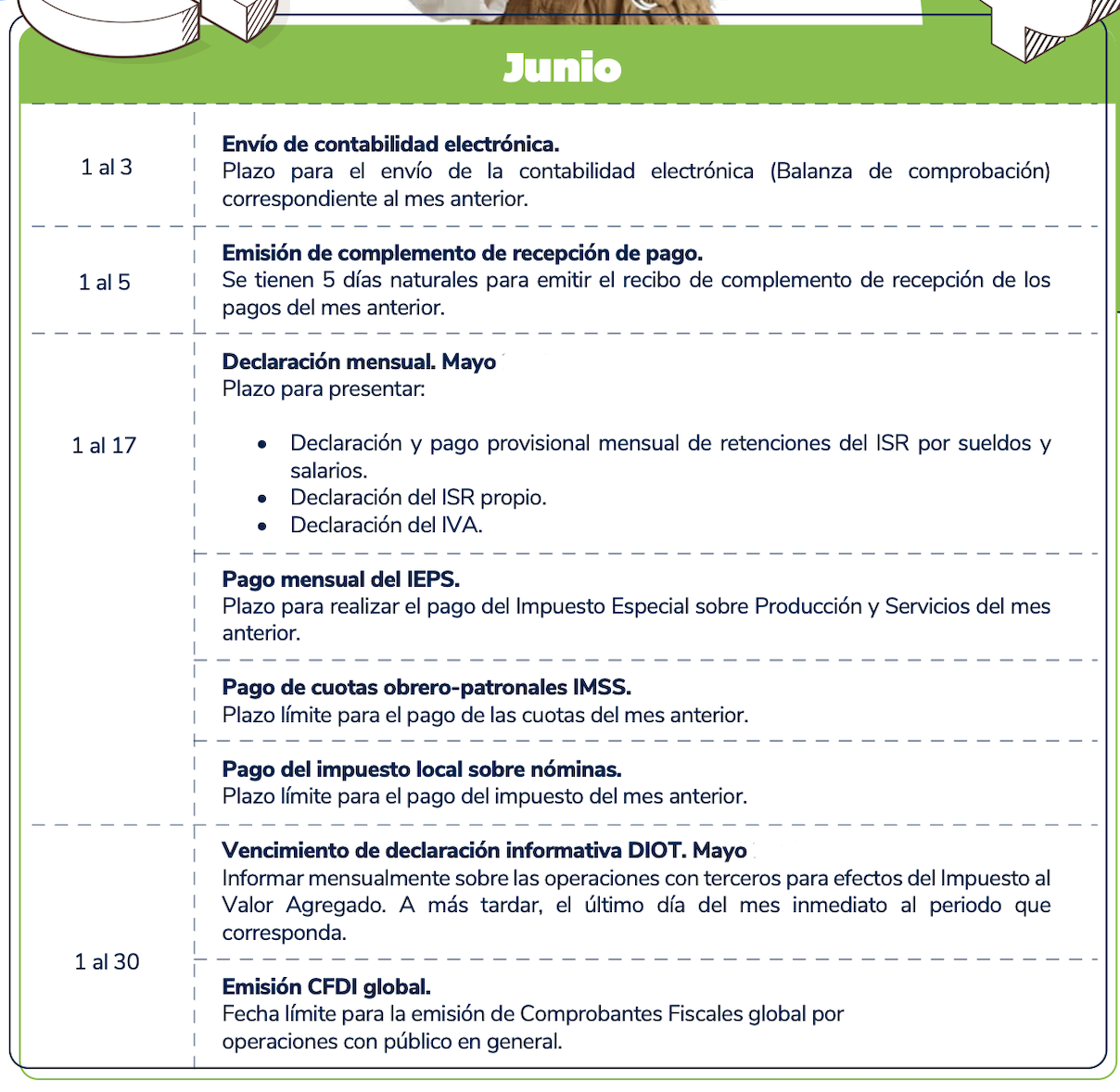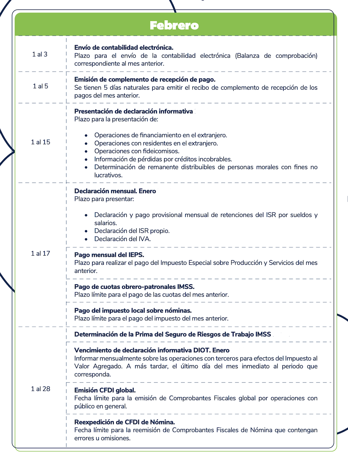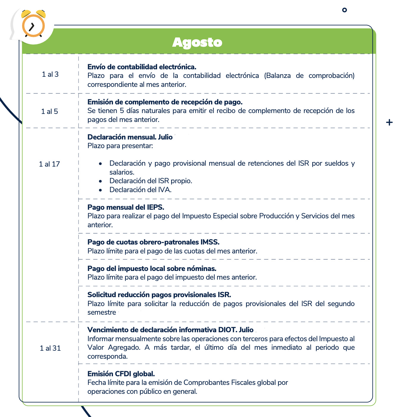 El presente calendario tiene carácter meramente informativo y debe utilizarse únicamente como una referencia general. Se recomienda verificar cualquier disposición con las autoridades fiscales competentes antes de tomar decisiones al respecto.